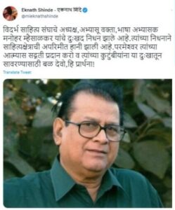 काल विदर्भ साहित्य संघाचे अध्यक्ष मनोहर म्हैसाळकर यांचे निधन झाले. त्यानंतर सगळ्यांकडून श्रद्धांजली वाहण्यात आली. मुख्यमंत्री एकनाथ शिंदे यांनी देखील त्यांच्या ट्विट हँडल वरून श्रद्धांजली वाहिली. मात्र, यावेळी निधनाबाबत दुःख व्यक्त करताना मुख्यमंत्र्यांकडून मोठी चूक झाली.