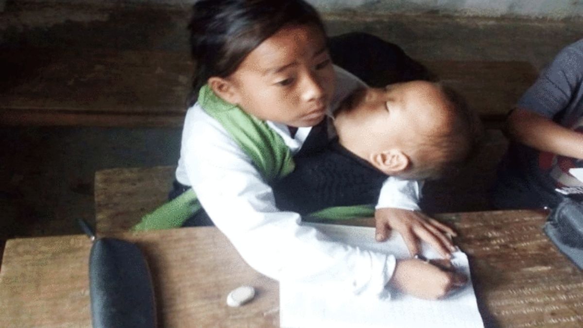 जिद्दीला सलाम! ११ वर्षांची चिमुकली भावाला मांडीवर घेऊन बसते शाळेत, फोटो पाहून तुमचेही डोळे पाणावतील